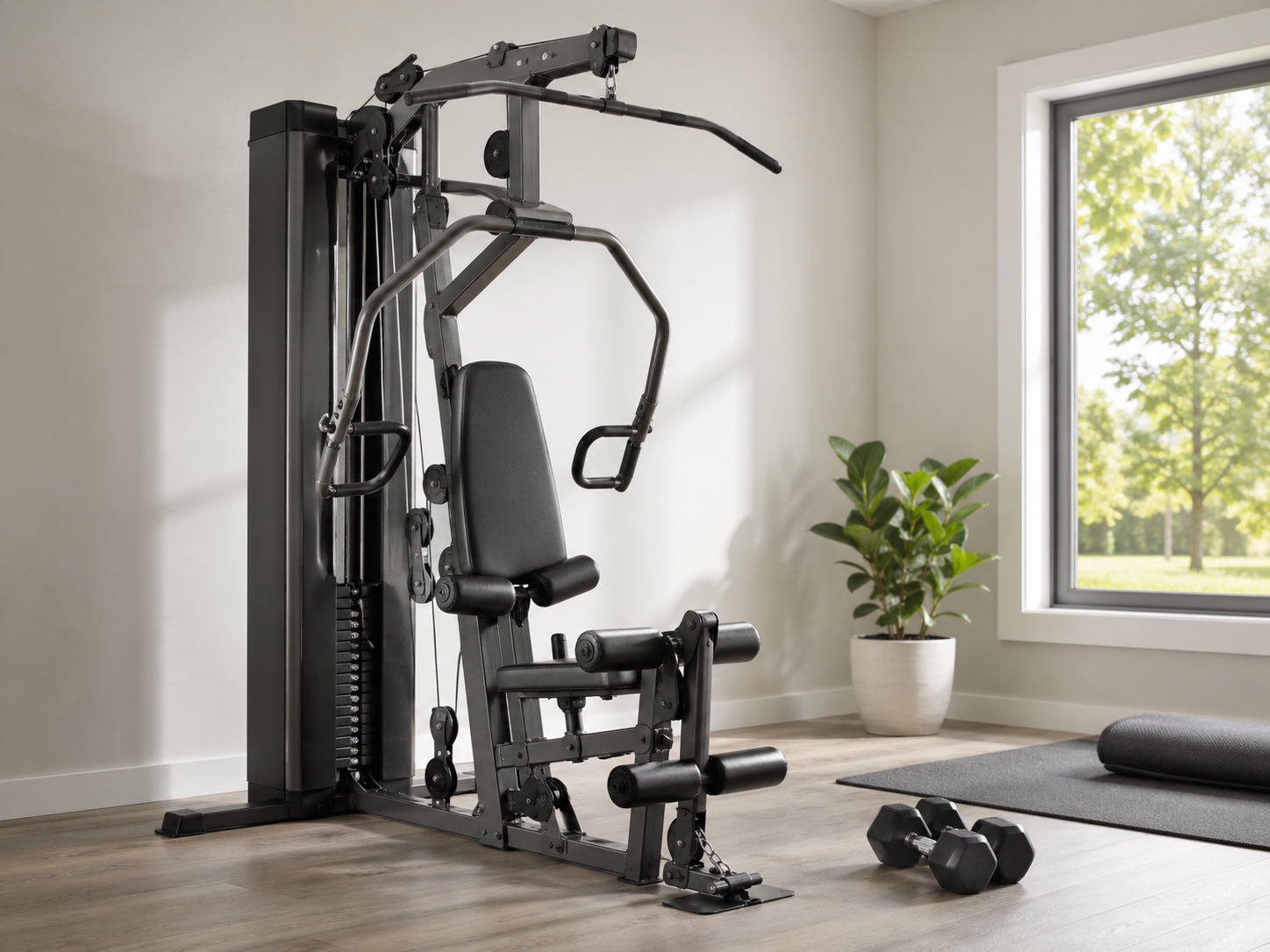 Такой тренажер выбирают, когда нужно тренировать разные группы мышц дома, но нет места или желания покупать отдельные станки, скамью, стойки и большой набор свободных весов.